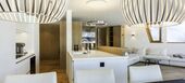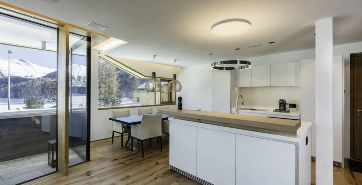 The highlight of this apartment is the spacious living and dining area as well as the kitchen. The kitchen is equipped with the latest appliances. The living room offers a wonderful view of Lake St. Moritz and the mountain panorama. The living room has a bio fireplace. In the rear area of the living room there is a cleverly separated bedroom from which you can also enjoy the view. This bedroom has an en-suite bathroom in Rhine quartzite. A long corridor leads to the other rooms: a sauna, a relaxation room, a playroom and another bathroom. The apartment and the individual rooms are equipped with comfort ventilation.