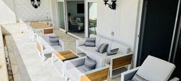 The apartment features 4 large bedrooms, 4 bathrooms, and a spacious living-dining room with access to a large terrace overlooking the sea. The complex boasts direct access to the promenade, beautiful gardens, a large outdoor pool, a heated indoor pool, a gym, and 24-hour security.