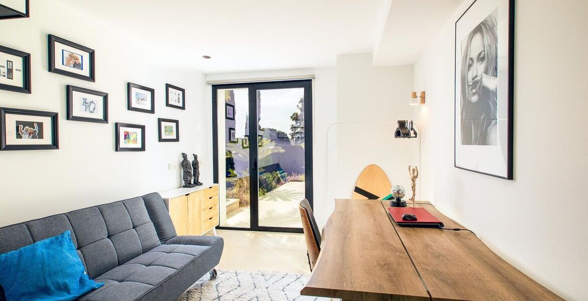 A flexible bedroom/office with a desk and a sofa (convertible to a double bed) and an ensuite bathroom with a walk-in shower provides an ideal space for remote work.