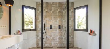 The villa is equipped with Sonos sound system, hot and cold air conditioning, and strong Wi-Fi throughout. The terraces also feature ceiling fans and wall-mounted heaters for year-round comfort. Covered parking is available for three cars.