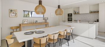 En la planta baja, encontrará una hermosa sala de estar con muebles modernos y una oficina adyacente. La cocina abierta está totalmente equipada y cuenta con una mesa de comedor (para 12 personas) con vistas a la piscina y al jardín. En la misma planta hay una sala de lavandería independiente, una sala de televisión y un gimnasio.