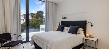 La villa dispone de 6 dormitorios dobles con baño privado. En la planta superior, hay 4 dormitorios con baño privado y vistas al jardín y la piscina: 3 dobles y el dormitorio principal, que cuenta con vistas al mar, baño privado con bañera, TV "oculta" y terraza privada.