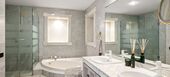 La planta superior, diseñada como planta familiar, alberga dos dormitorios adicionales. Uno incluye una cama cómoda y un área de trabajo. La suite principal es un refugio de lujo, completo con un vestidor, una terraza privada que ofrece impresionantes vistas y un elegante baño en suite con bañera de hidromasaje y ducha independiente. El dormitorio principal también ofrece arreglos flexibles para dormir con una cama espaciosa y una cama cómoda adicional.