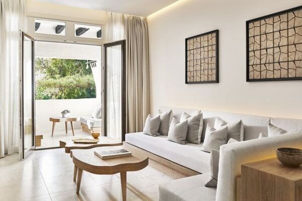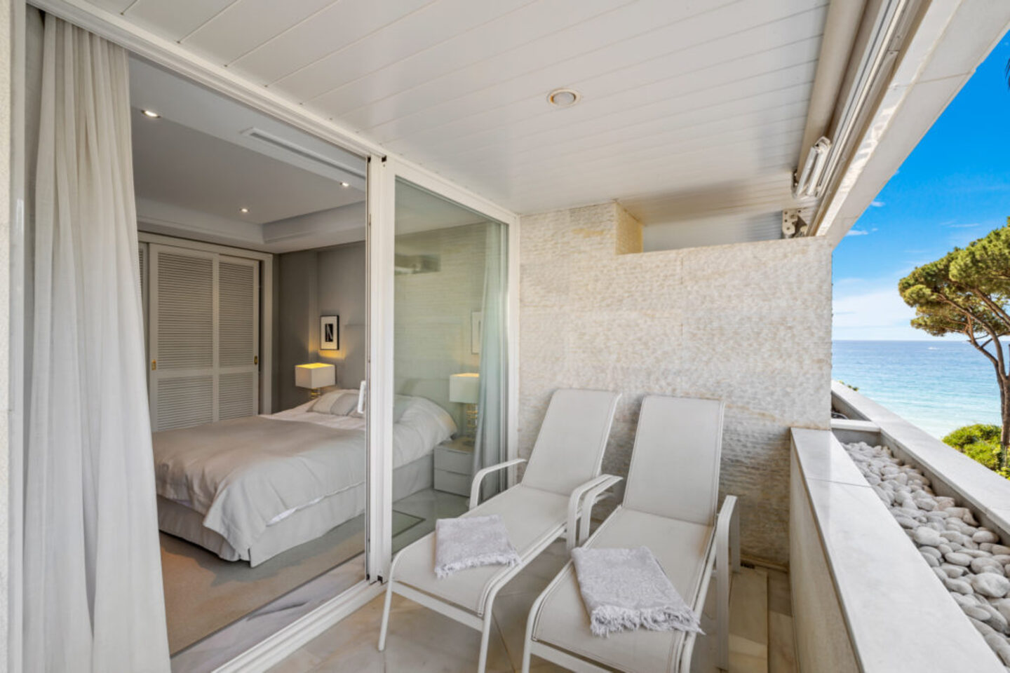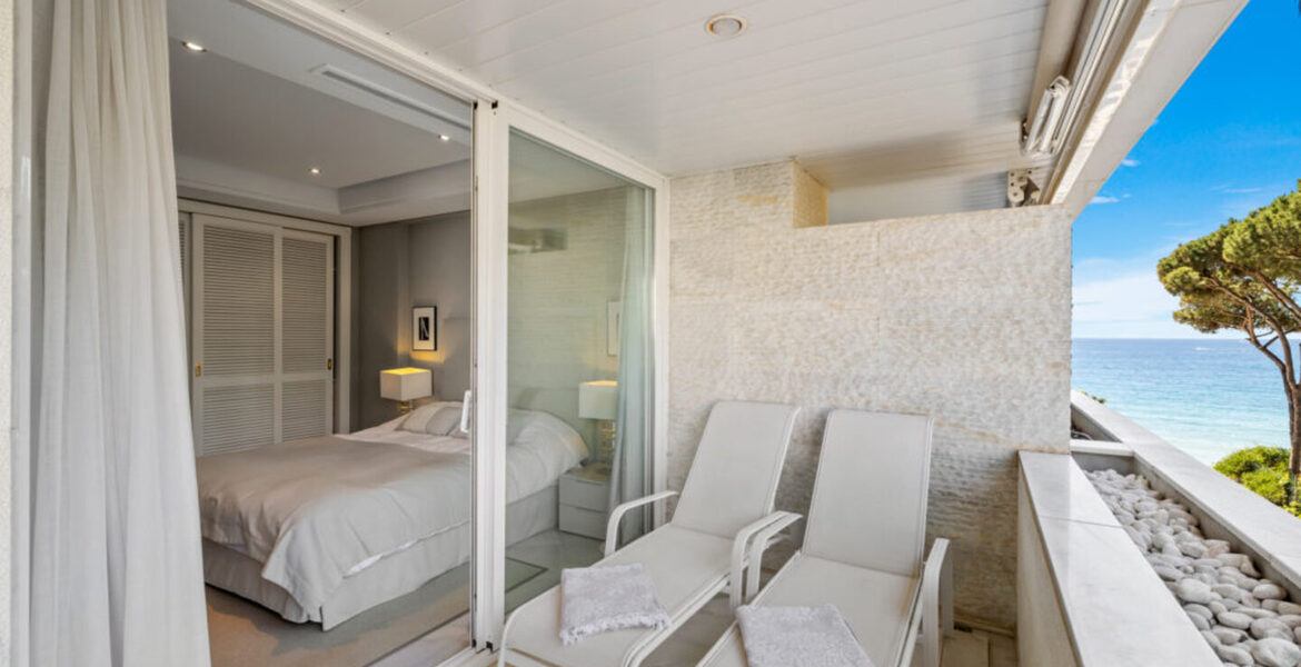 Tastefully decorated, this 100m2 apartment boasts a spacious living/dining room with large sliding doors leading to the private terrace (side sea and mountain views) with sunbeds as well as an outdoor dining area. With the sun shining and the sound of the waves, this is the perfect place to lay back with a cool drink and enjoy your holiday, not to mention the sunsets!