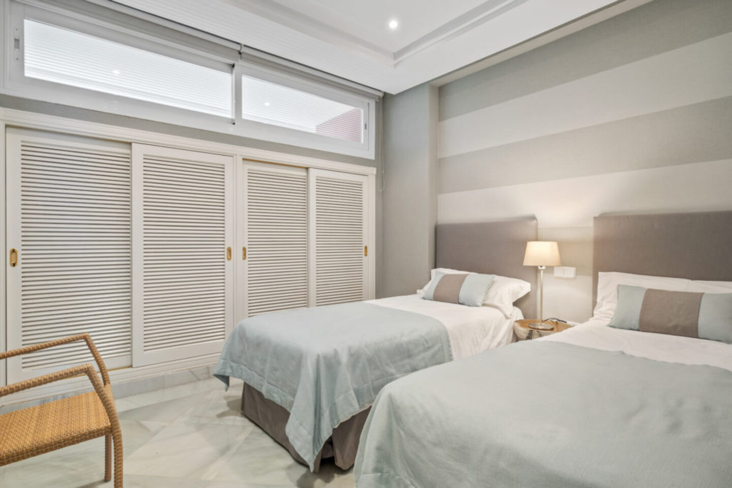 There are two bedrooms, one double with ensuite bathroom and access to the terrace, and one with twin beds. There is a second full bathroom. Both bathrooms have a bath with incorporated shower.