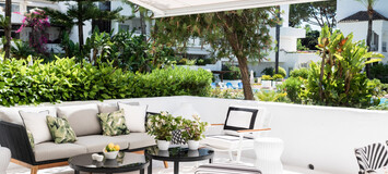 This beautiful ground floor apartment is for rent in Alhambra del Mar, situated on Marbella's Golden Mile, between the harbor of Puerto Banus and Marbella's old town. The apartment is in a beachfront residential gated community, which has lagoon-style communal pools, which you can see from the apartment, and it includes 24hrs security service. The apartment has been recently renovated giving it a new modern look, including three bedrooms, three bathrooms, the master bedroom having access to the terrace, a fully equipped kitchen, open to the spacious dining and living area that also have access to its large private terrace.