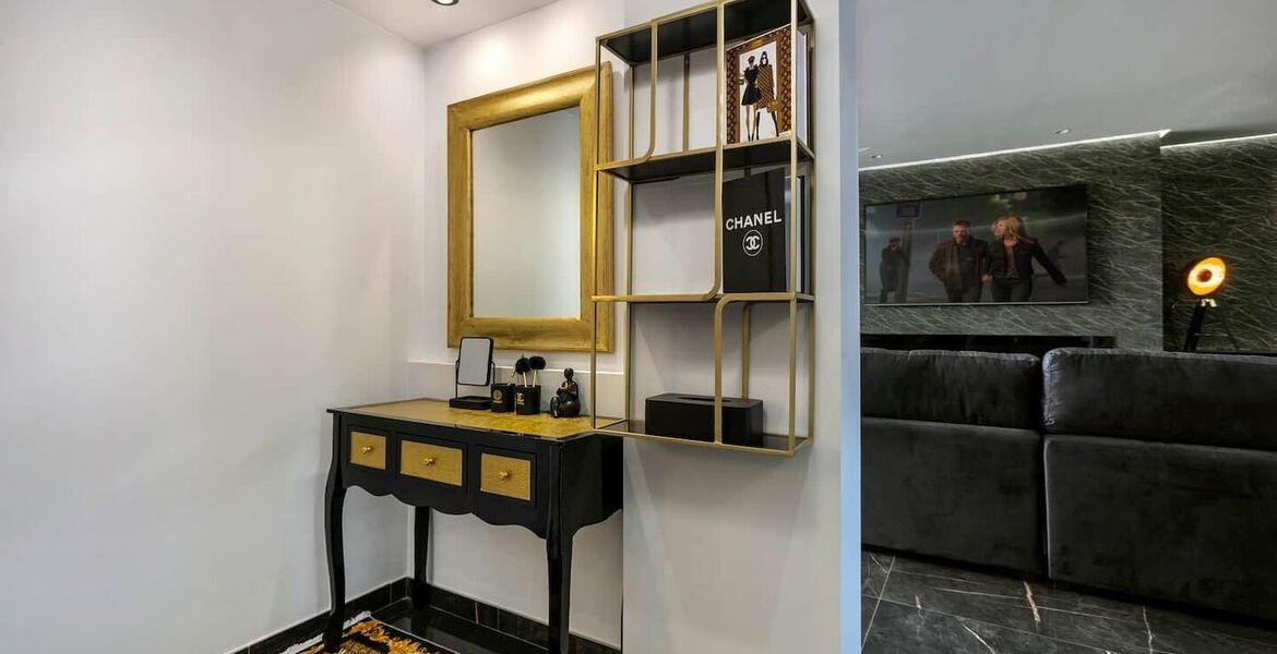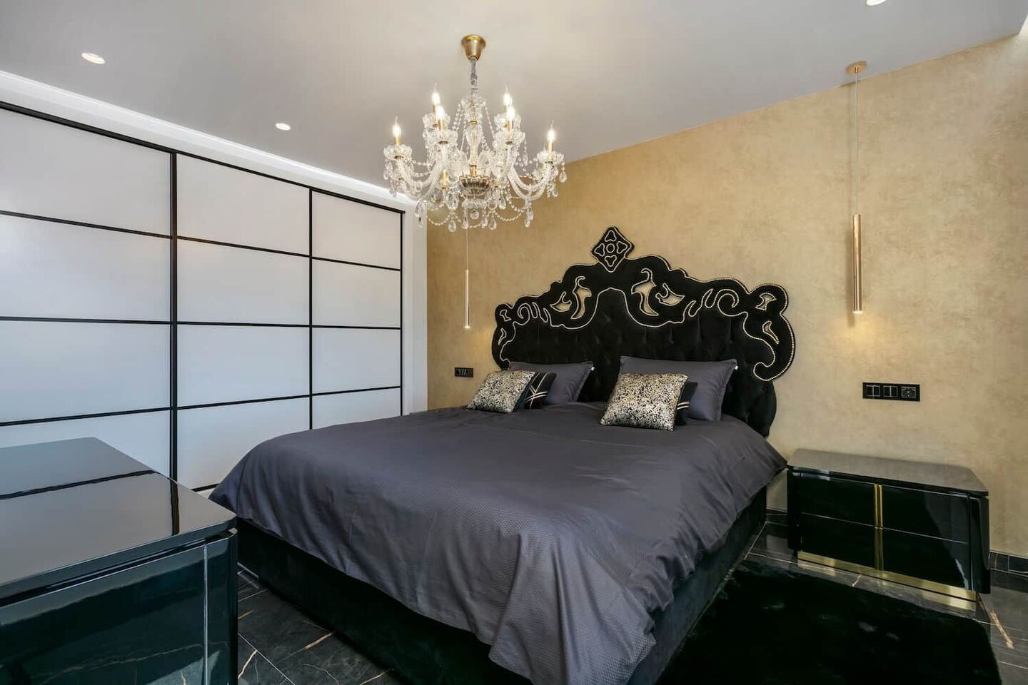 The master bedroom has a double bed, ample wardrobes, a smart TV, and an en-suite bathroom with a rainfall shower. The guest bedroom also has a double bed, a smart TV, a dresser for storage, and access to the guest bathroom (also accessible from the living room).