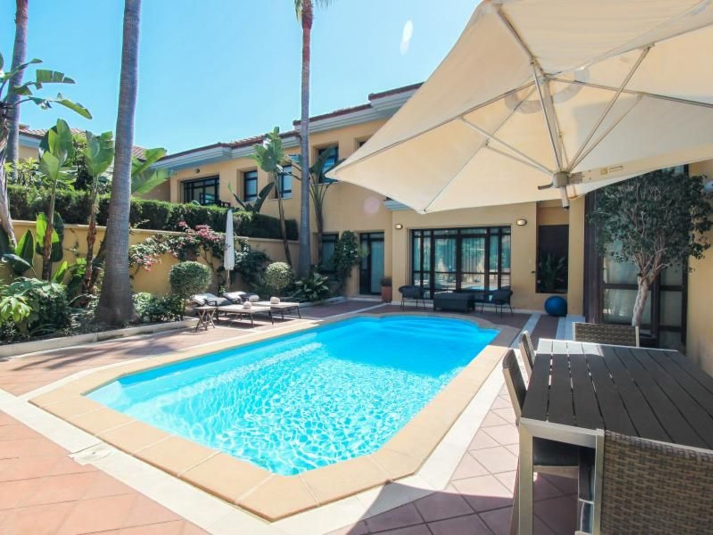 The property boasts its own private swimming pool. The accommodation comprises of an entrance hall, guest cloakroom, open plan fitted kitchen with dining area, utility room, very spacious lounge with high ceilings leading out to a terrace and the swimming pool. Two-guest bedrooms with en-suite bathrooms with ample wardrobes separated by a cozy chill-out room. Massive master bedroom with en-suite Jacuzzi bathroom. High quality finishes and design, with hot and cold a/c throughout and under floor heating in the bathrooms. 24-hour guard gated and secure community with immaculate exotic tropical gardens, gymnasium, sauna and two communal swimming pools.