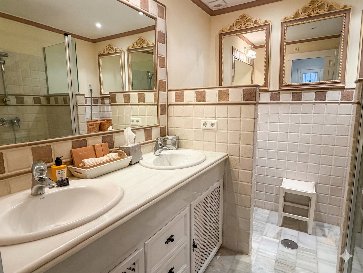 • Baño: Mármol premium, doble lavabo, bañera profunda y ducha de efecto lluvia.