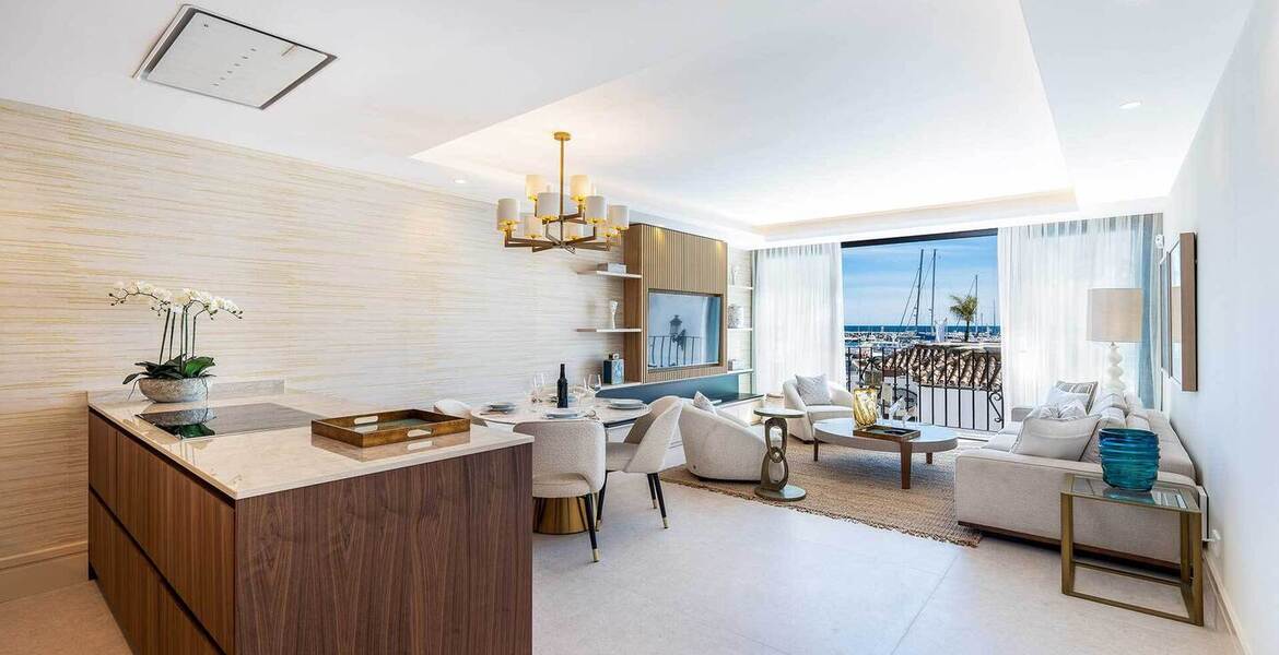 L'appartement, situé sur un seul niveau, comprend deux chambres doubles spacieuses, dont l'une est dotée d'une salle de bains privative. L'élégant espace de vie et la cuisine ouverte offrent une vue imprenable sur les bateaux à l'extérieur. Le salon et la salle à manger constituent l'attraction principale de l'appartement, avec un mélange de mobilier moderne et de décoration contemporaine, le tout agrémenté de vues impressionnantes. Cet espace élégant crée une atmosphère sereine qui complète parfaitement l'emplacement central de la propriété.