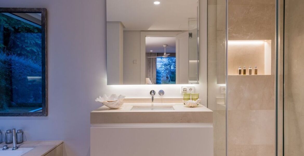 Également au niveau de l'entrée, la propriété dispose d'une salle de bains pour invités et d'une chambre double avec 2 lits, à partir de laquelle les fenêtres coulissantes offrent un accès direct à une zone isolée du jardin luxuriant. La chambre, comme toutes les chambres de la villa, dispose d'une salle de bain privative. Il convient à une famille qui souhaite disposer d'une chambre séparée pour le personnel. Cette chambre est desservie par un ventilateur de plafond.