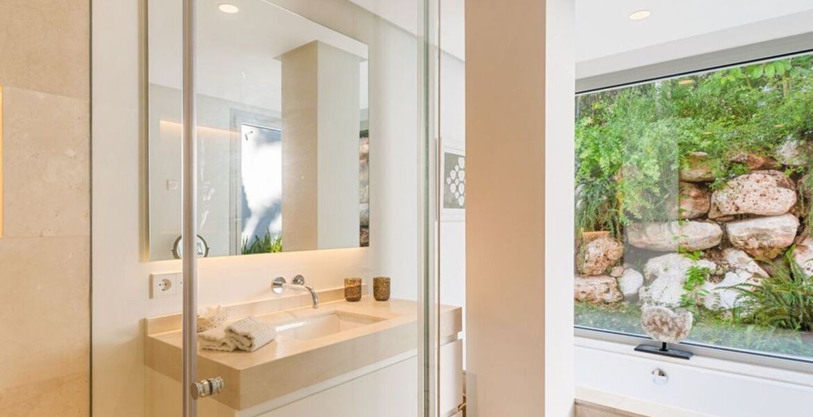 L'accès à la propriété se fait par un portail électronique et une allée mène au parking, couvert de vignes dressées. À côté de la porte d'entrée, une fontaine moderne avec une touche typiquement andalouse orne la façade nord de la villa. Une fois entré par la porte d'entrée en acajou double largeur, le hall d'entrée mène à l'espace de vie ouvert de la Villa. Une superbe façade centrale en verre à double hauteur encadre l’attrayante piscine saline de 17 m.