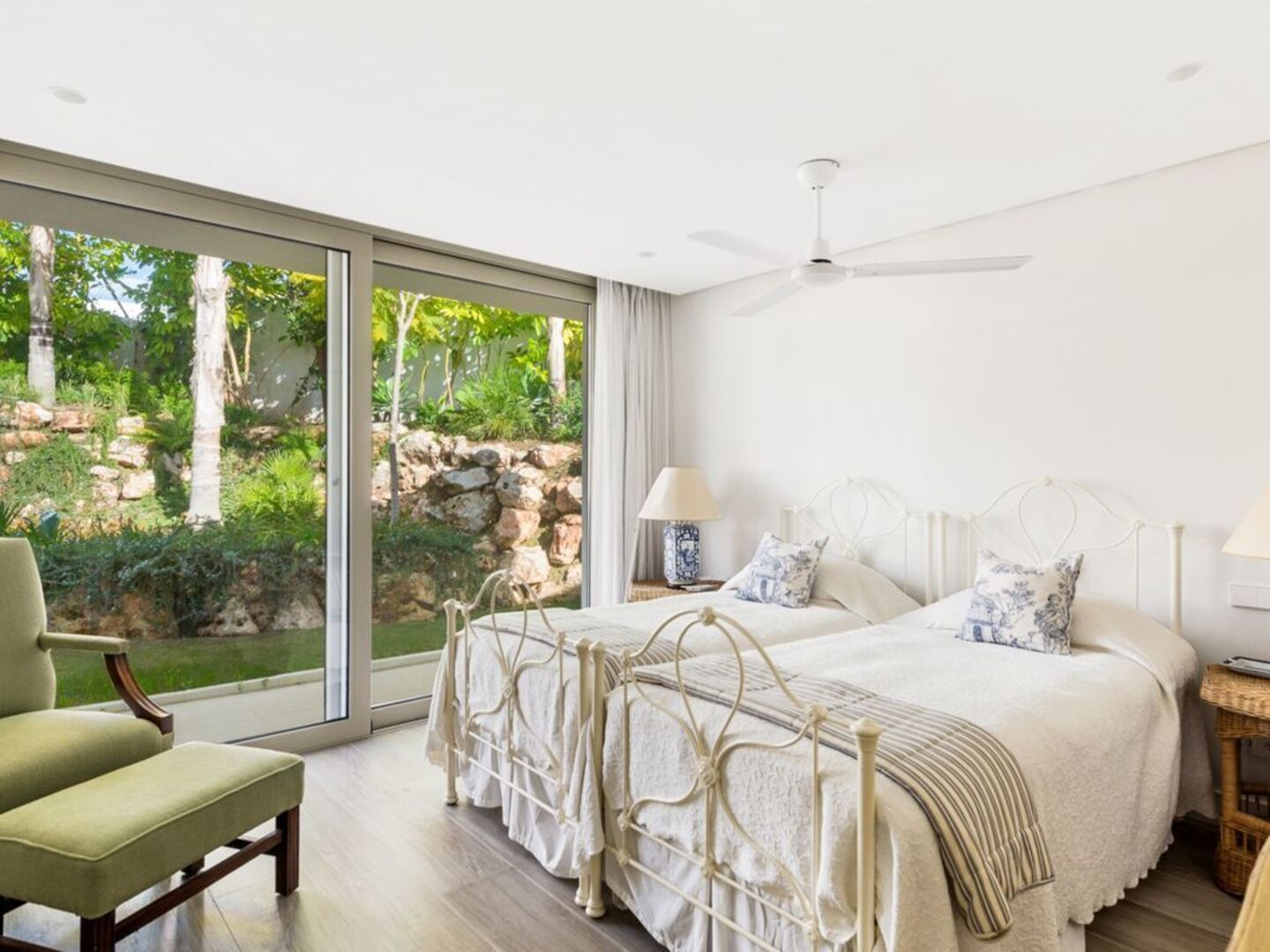 À gauche se trouvent trois autres chambres à coucher qui ont chacune un accès direct aux terrasses et au jardin. Ces chambres sont desservies par des ventilateurs de plafond. Deux des salles de bains des suites comprennent des salles de bains avec baies vitrées pour vous donner l'impression d'être dans le jardin lui-même.