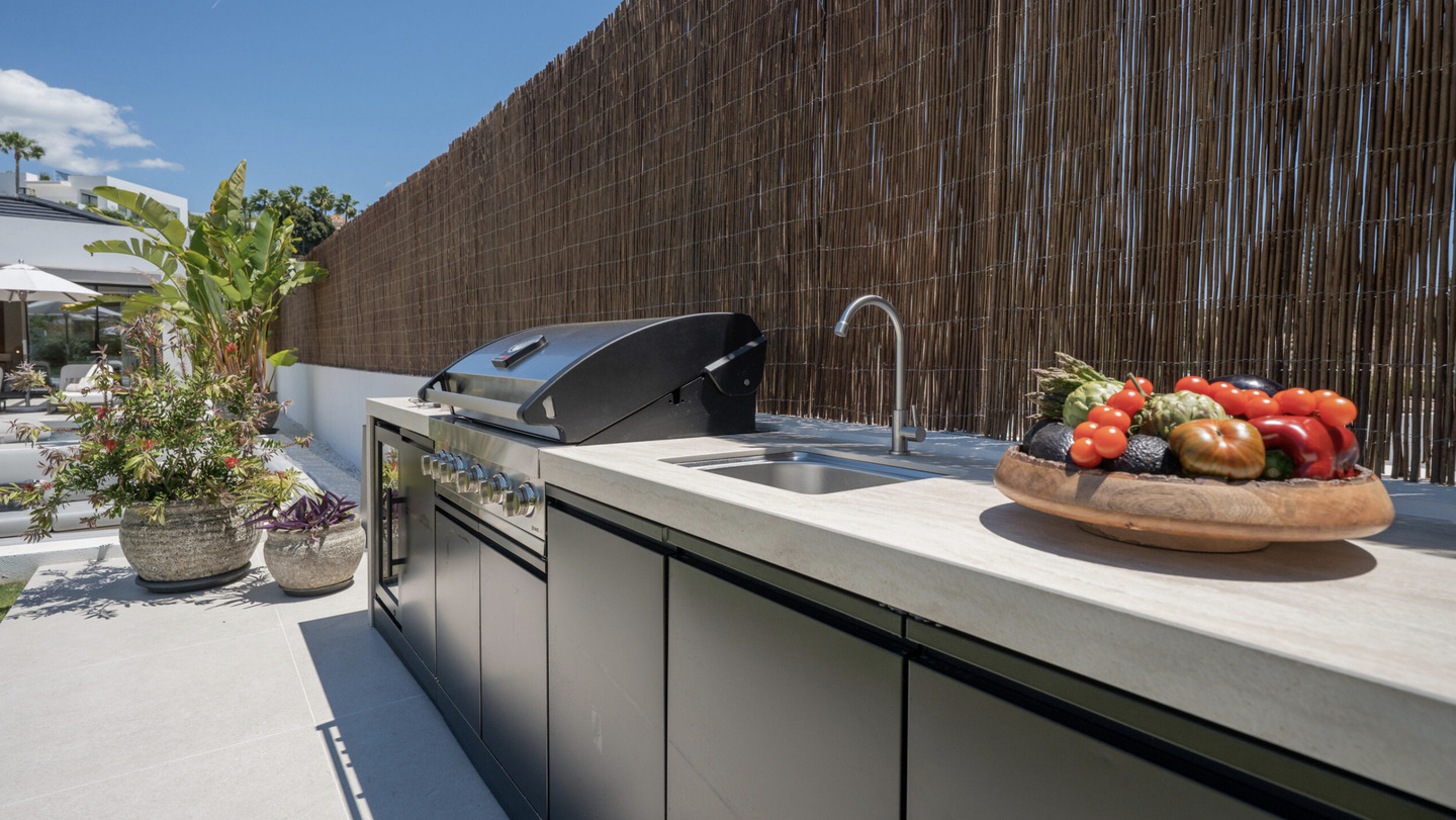 À l'extérieur, des jardins soignés entourent une superbe piscine privée, tandis que la terrasse dispose d'une cuisine extérieure et d'un barbecue entièrement équipés.