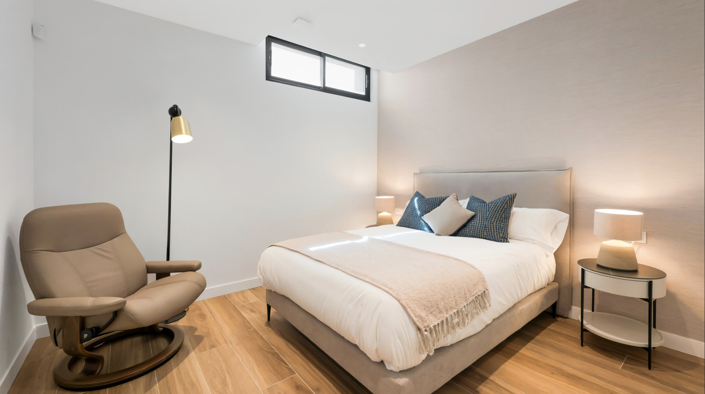 Niveau inférieur : Deux chambres, un bureau élégant et une salle de bien-être (yoga/pilates).