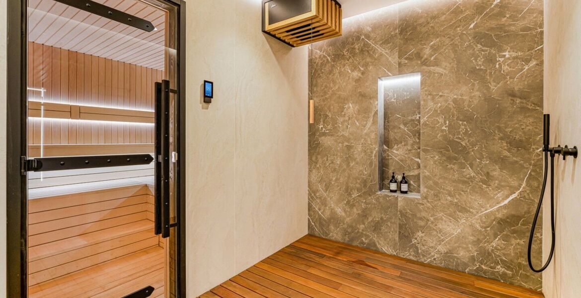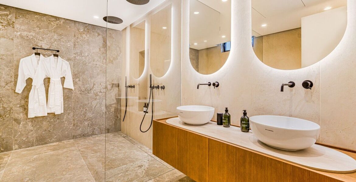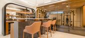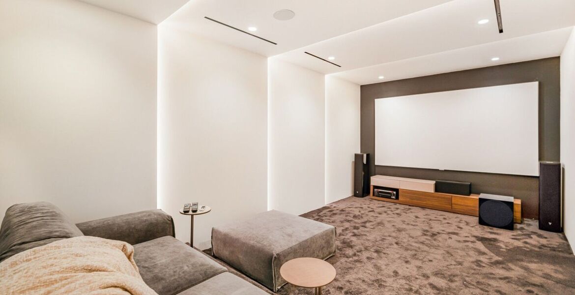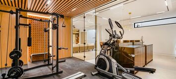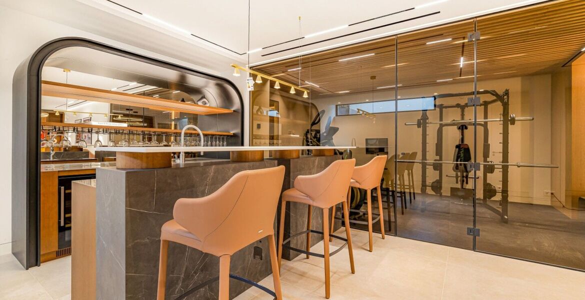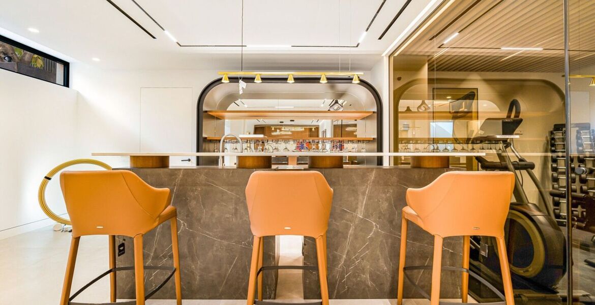 Le niveau principal comprend un salon ouvert, une salle à manger et une cuisine moderne, s'ouvrant sur une terrasse couverte avec une cuisine extérieure, un barbecue et une piscine privée. Le sous-sol comprend une salle de cinéma, une salle de sport, un sauna et un bar.