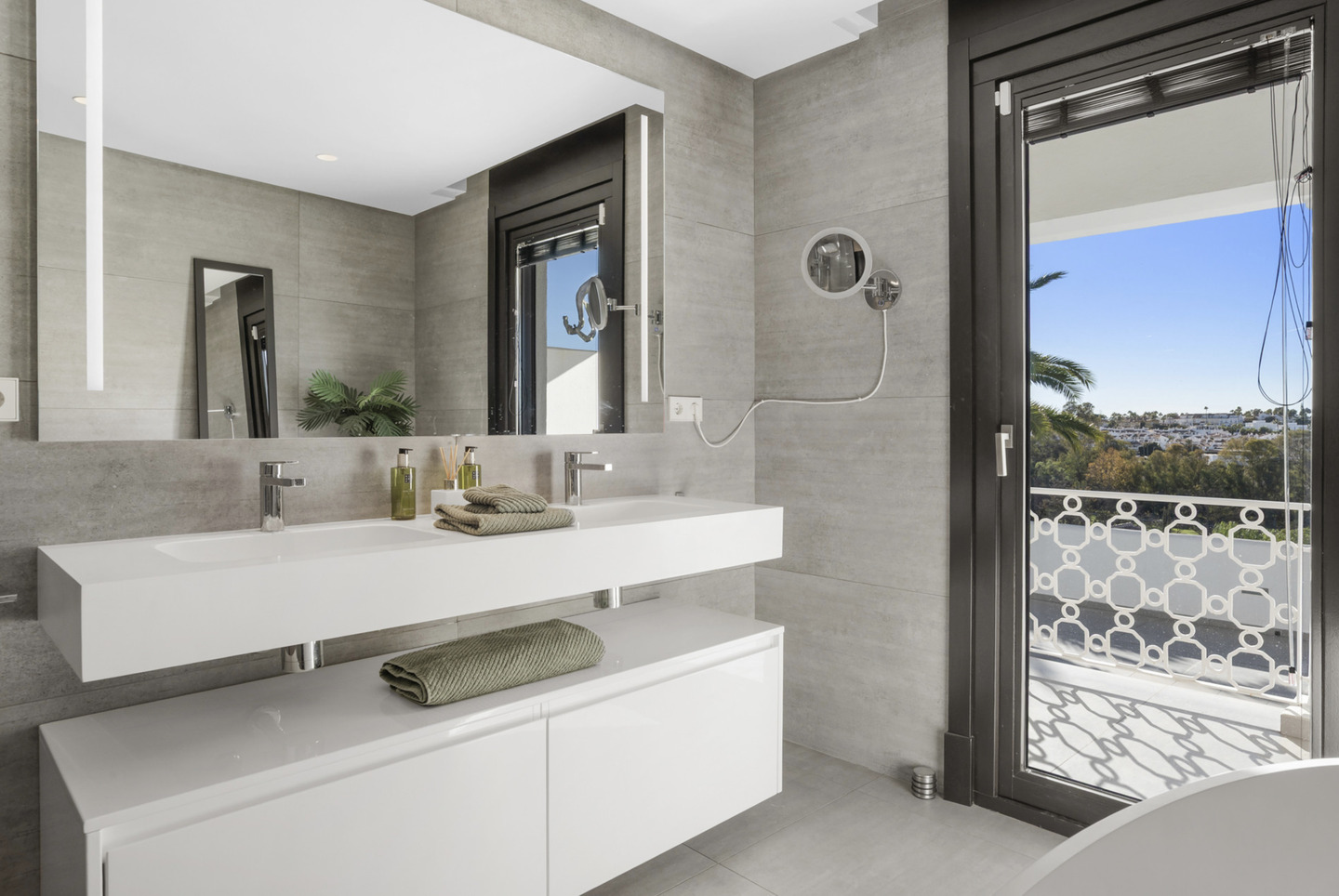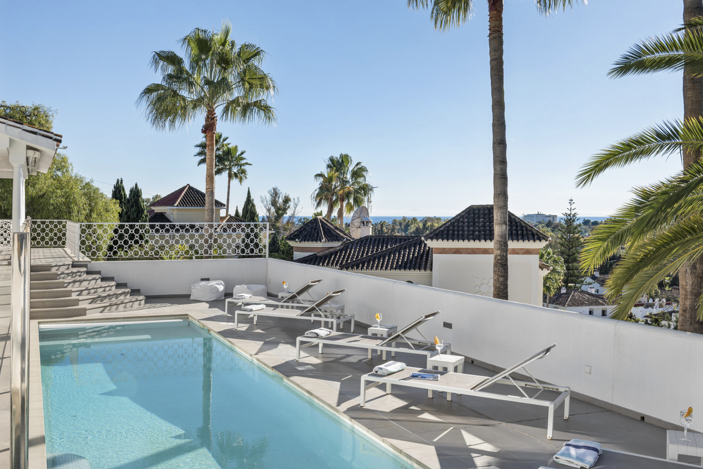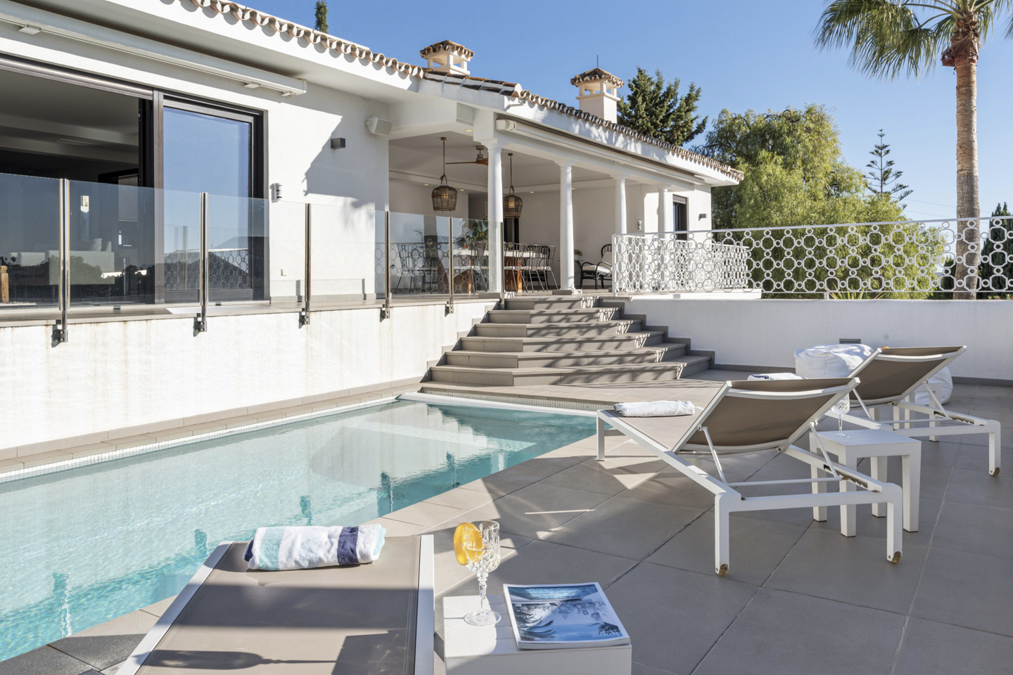 Добро пожаловать в ваш частный оазис в Гуадальмина Альта — потрясающую одноуровневую роскошную виллу, где современный дизайн сочетается с абсолютным комфортом. Этот дом с 5 спальнями и 5 ванными комнатами предлагает идеальное пространство для жизни, а главным украшением является дизайнерский бассейн с великолепным видом на море и долину.