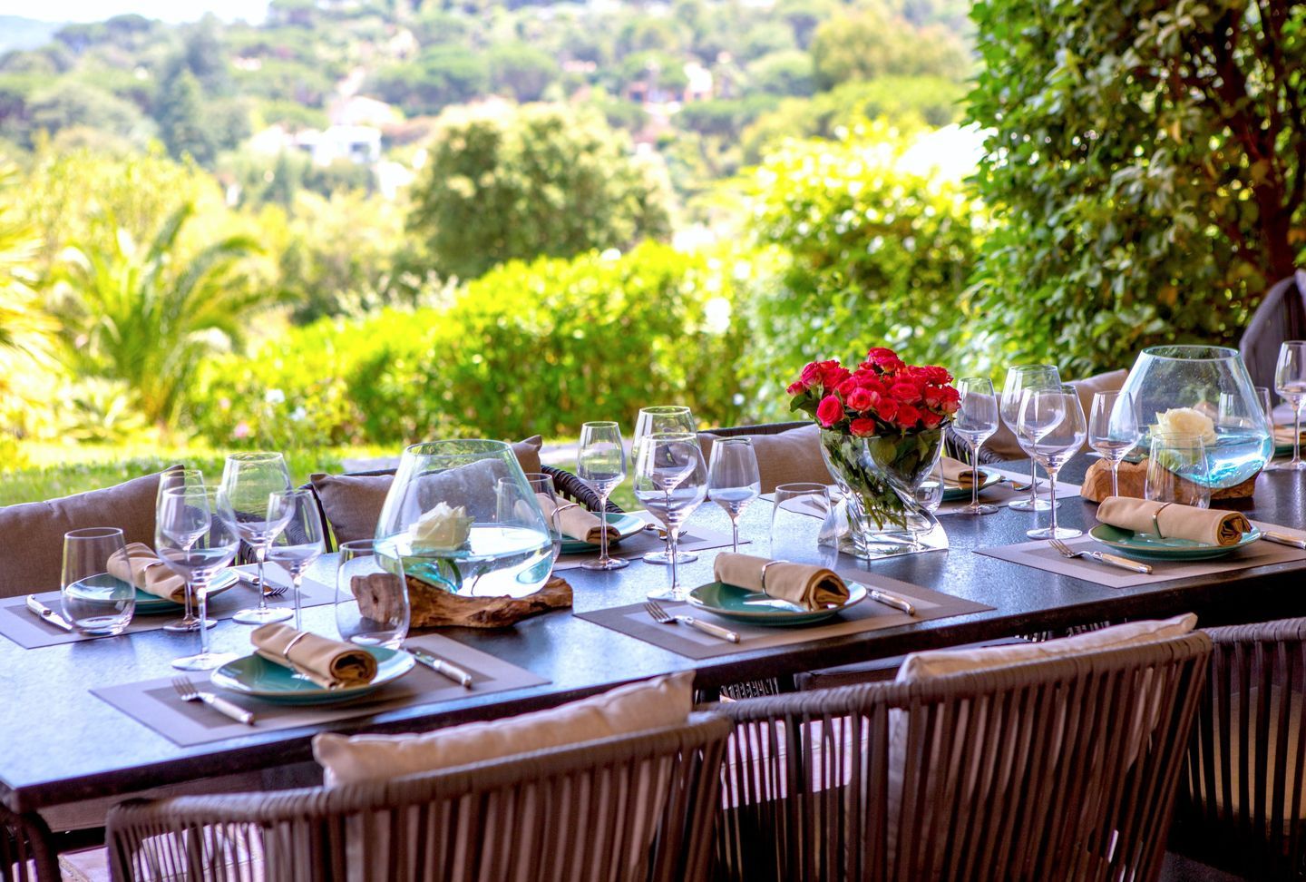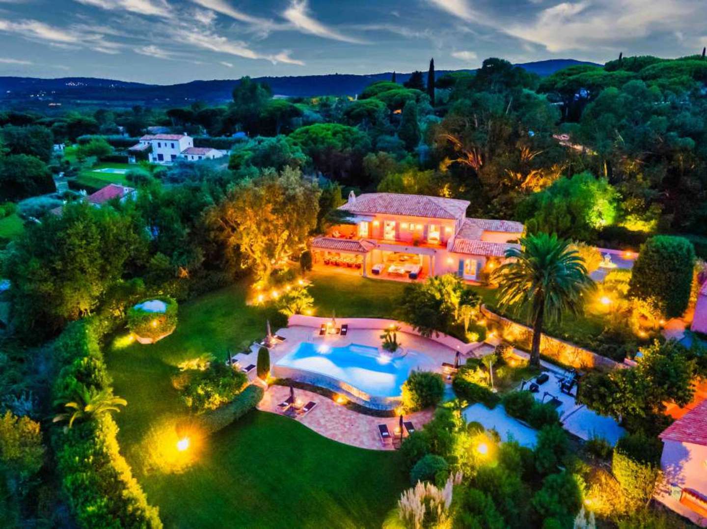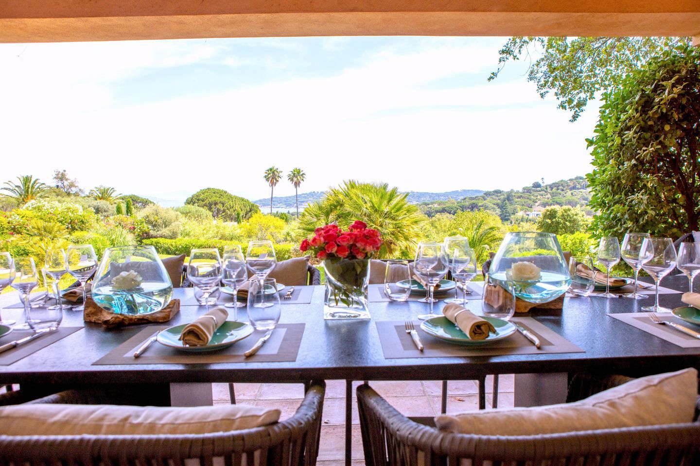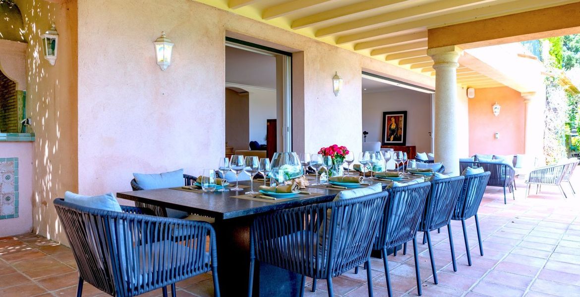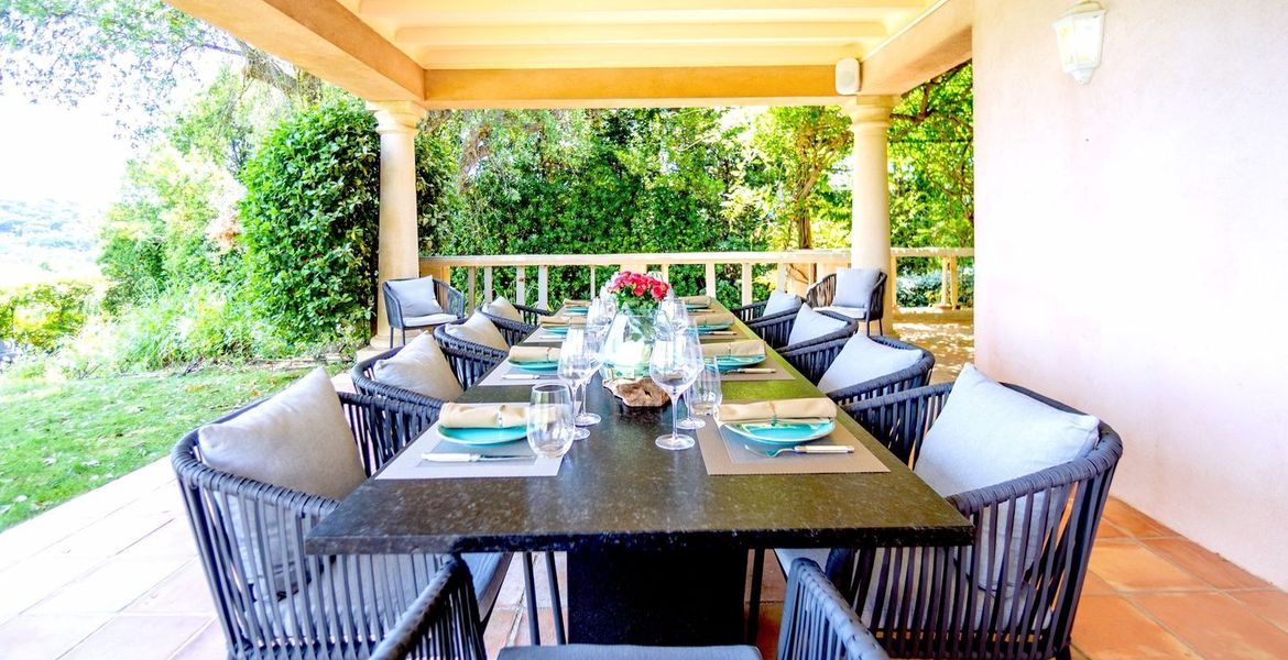 The whole on 320 m2 of living space (280 m2 reserved for VIPs) + 200 m2 of outdoor living space (covered terraces, pergola, ramade and balconies) on 4,800 m2 of land planted with trees and landscaped with Mediterranean species, overlooking the vineyards of the Belle Isnarde hill (dominant view of the Baie des Canoubiers and the Château Borelli)