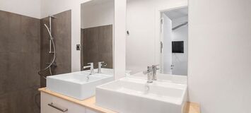 The Living Area is open plan where you find – on the entrance level to the right – the indoor dining area for 12 persons and also the laundry room with washing machine and tumble dryer. The living room, kitchen, and recreational area are one level down.