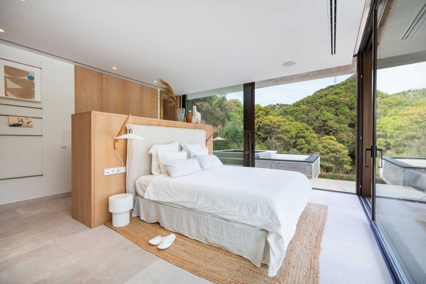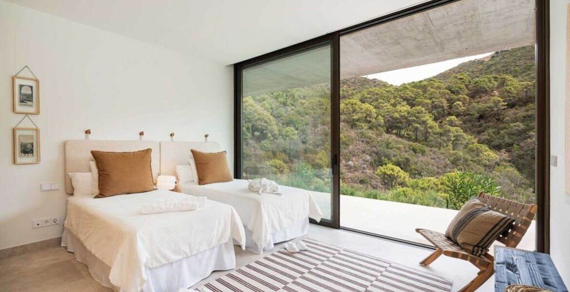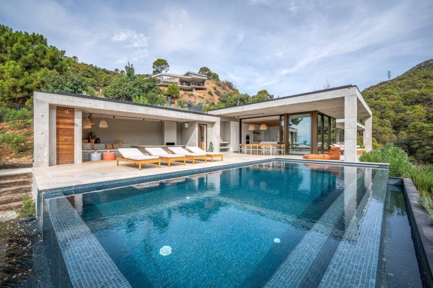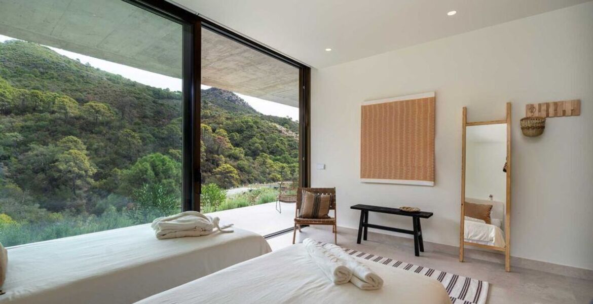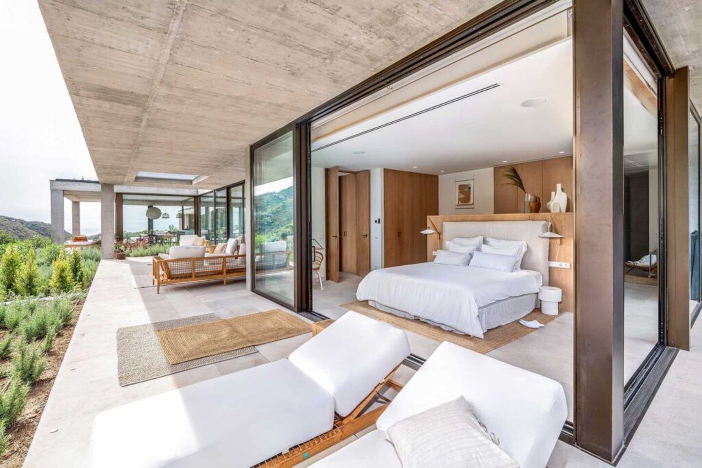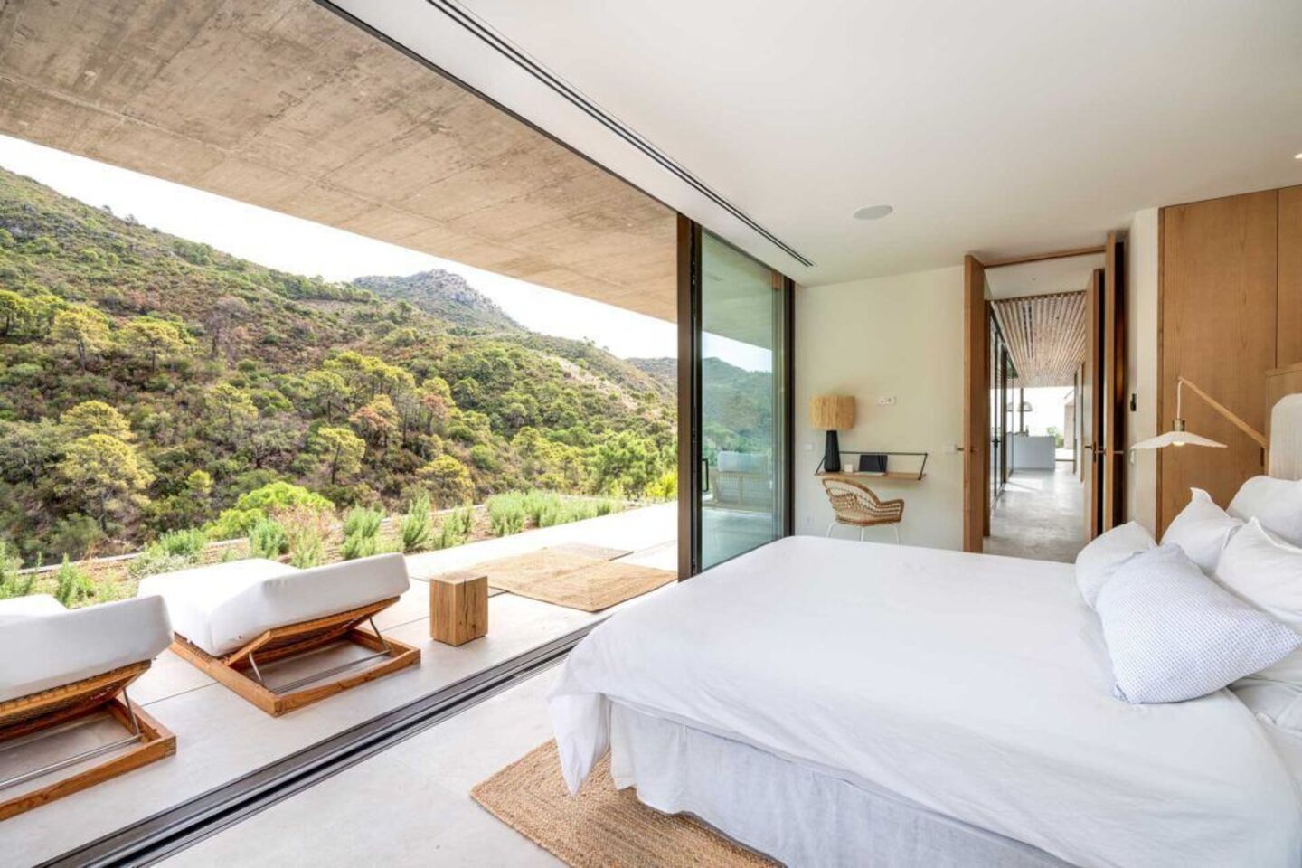 This 5-bedroom, 5-bathroom property is a harmonious blend of luxury and nature with clever and non-fussy design. This haven near Marbella has a twist of the Scandinavian aesthetic to add that reassuringly functional yet stylish feel. The property is set over three levels. Park on the top level, and then walk down to the main floor, which encompasses the lounge, terrace, pool, and the master suite. The lower level is where you’ll find the remaining bedrooms, which include three more en-suites and a child’s room with two bunk beds.