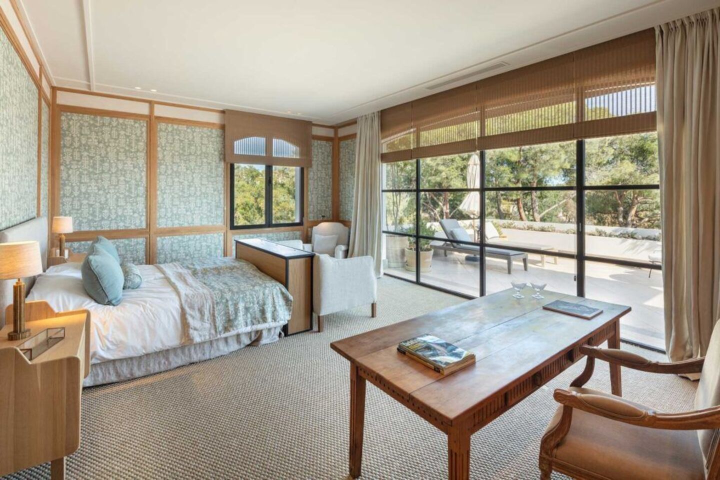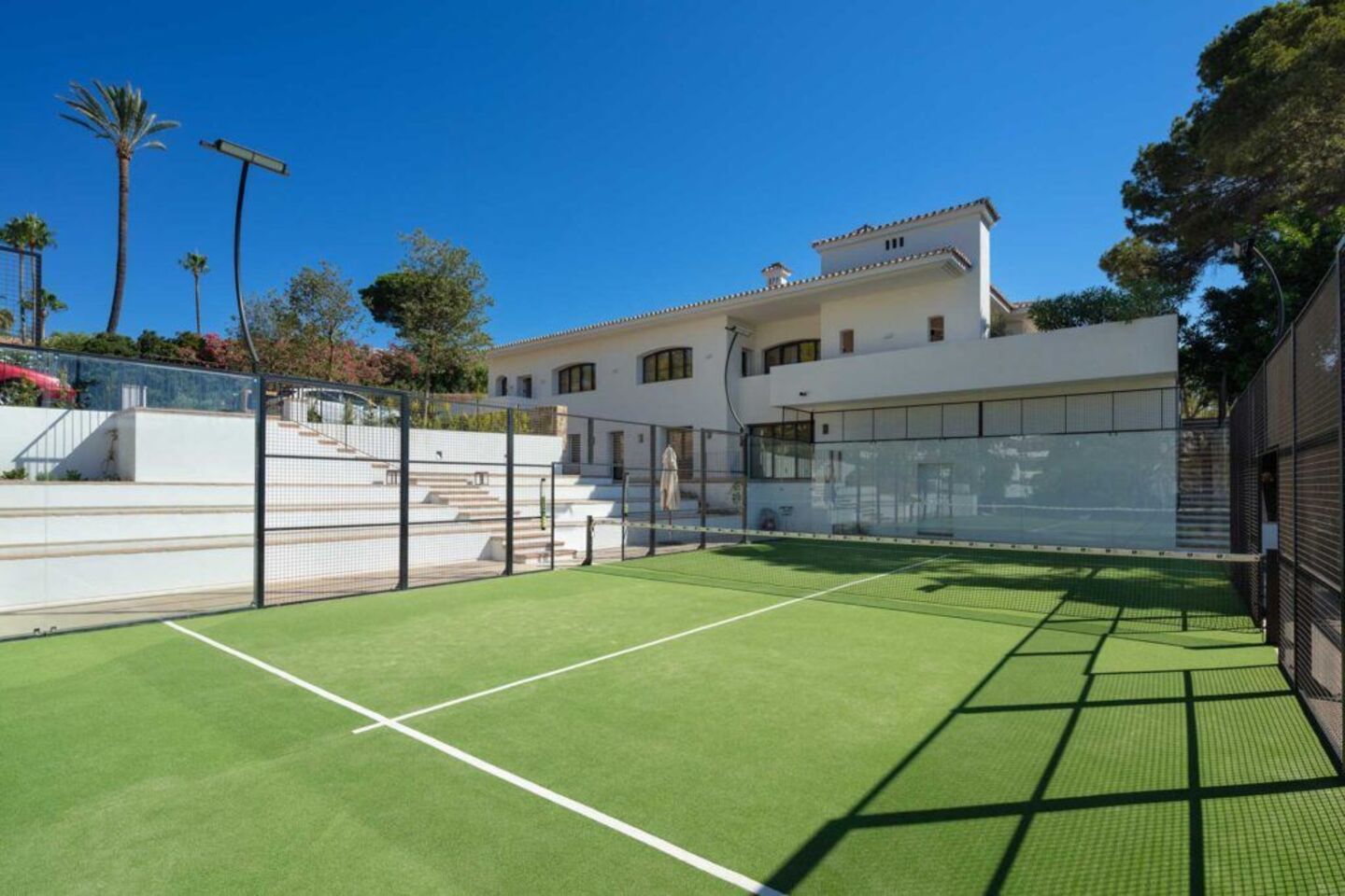 Now for the guided tour: When you enter the main house you will find a huge living room, two kitchens as well as 4 of the luscious bedrooms on the ground floor. But, it’s down in the basement where the fun really starts; let’s call it the entertainment floor. Here you will find the cigar room, a bar, an indoor pool, sauna, cool pool, the theatre with its own cinema room, a massage room and a game room. Get involved! The separate guest house at Villa is equally impressive in its own right, with 2 floors, 3 bedrooms, ensuite bathrooms and a charming terrace of its own. It goes without saying the property’s exterior is just as fitting for a residence of this standing. With mature gardens, an enormous pool and well-designed patio with covered areas. Holidays here will feel like you have been to your own private hotel, but one where you get to choose the guests!