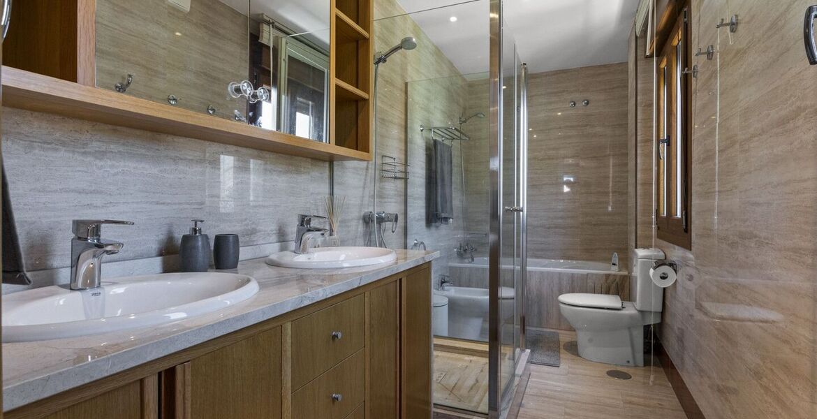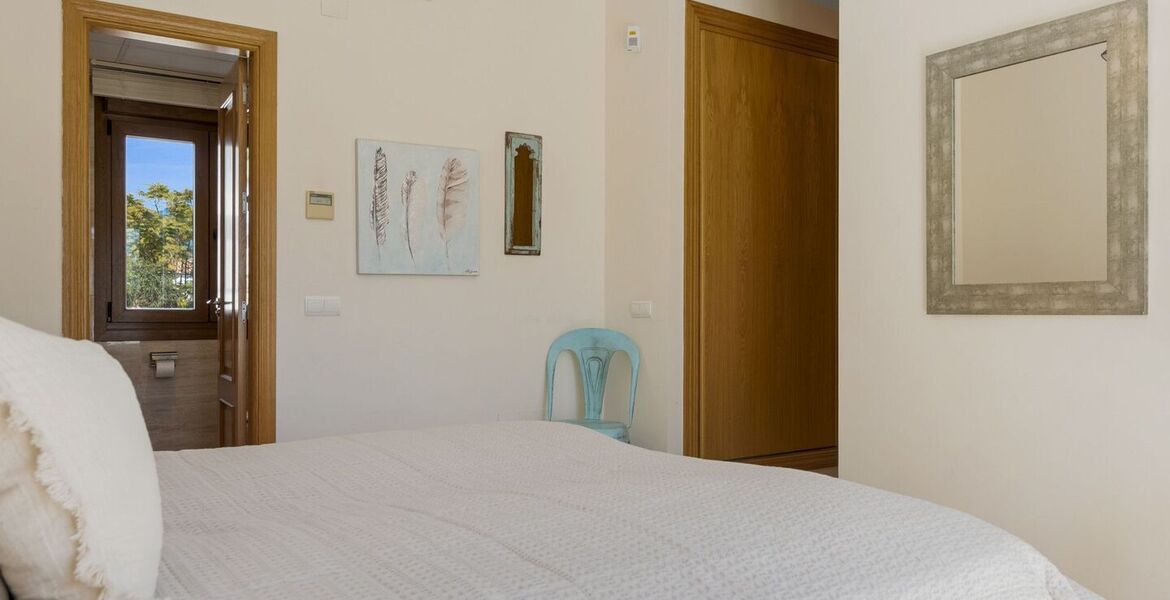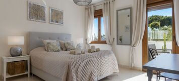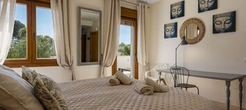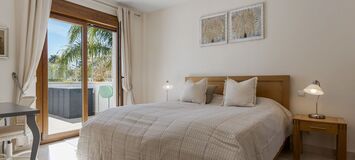 Upstairs is the Master Bedroom with ensuite shower room, walk-in closet and a private terrace (with sunbeds). Opposite to the Master, there is a double bedroom with ensuite bathroom.