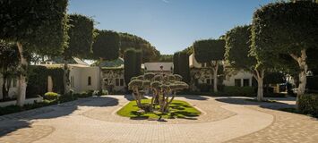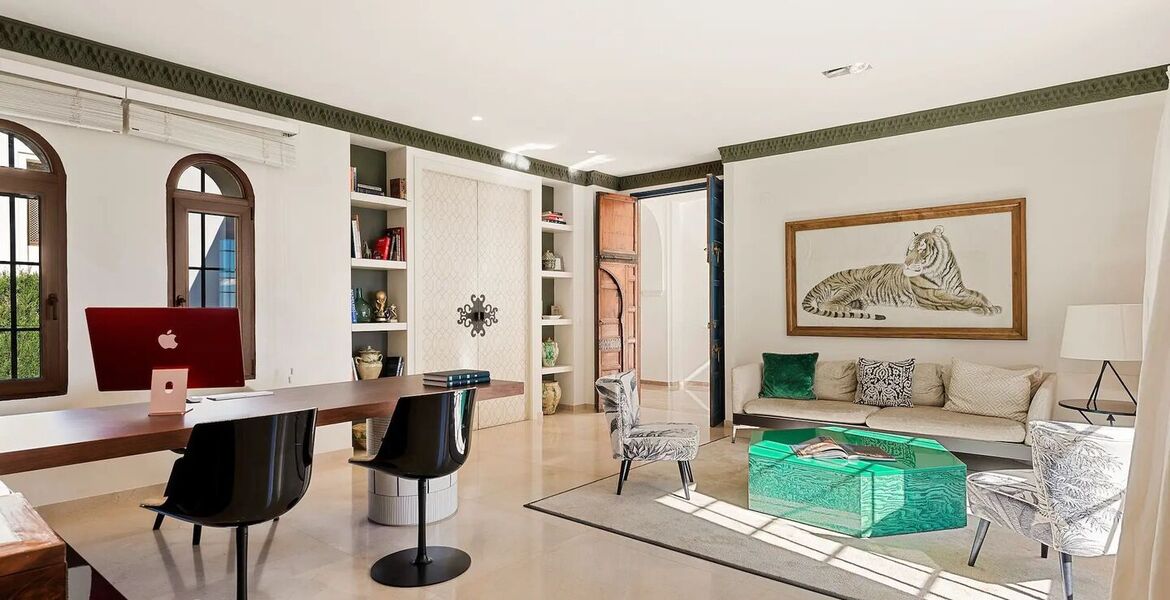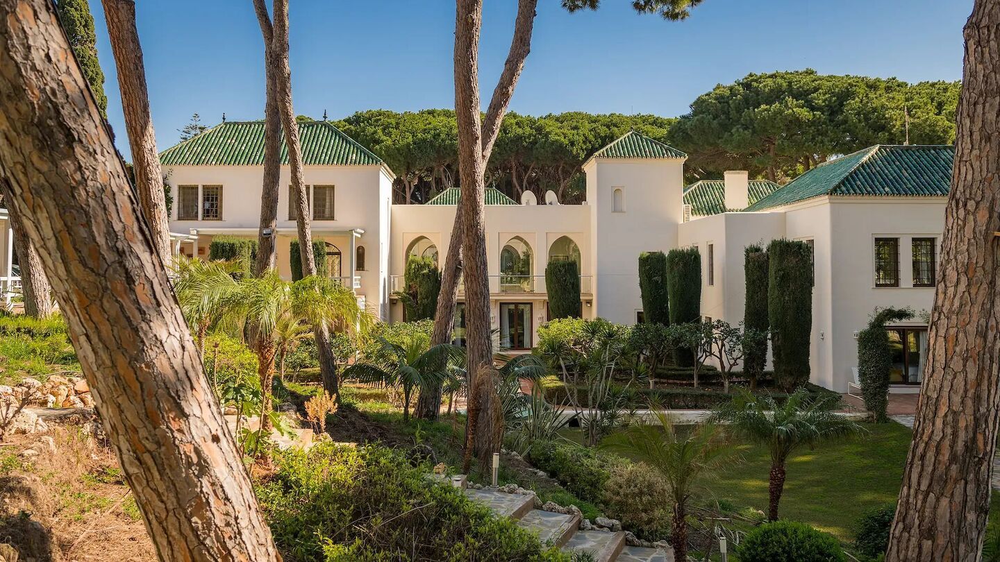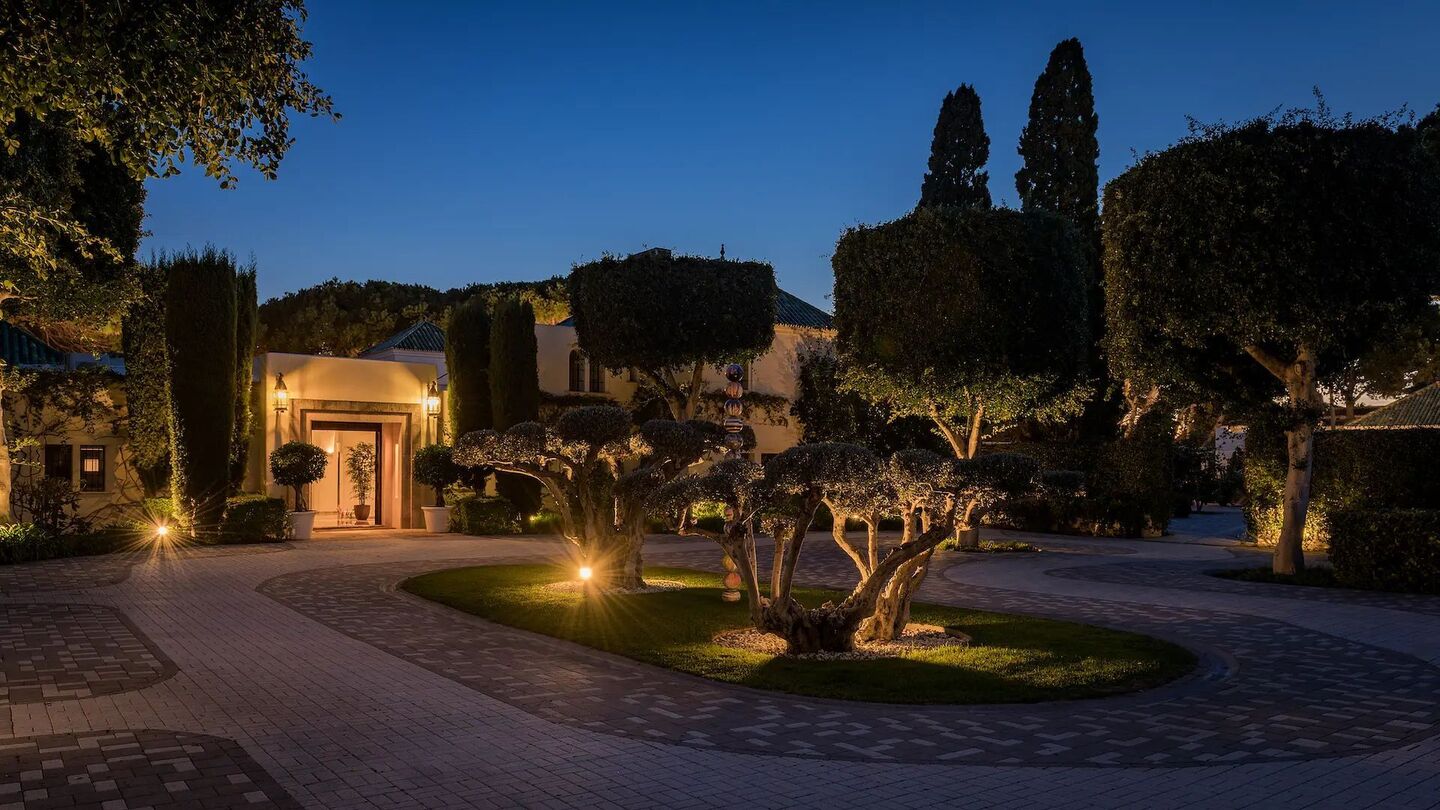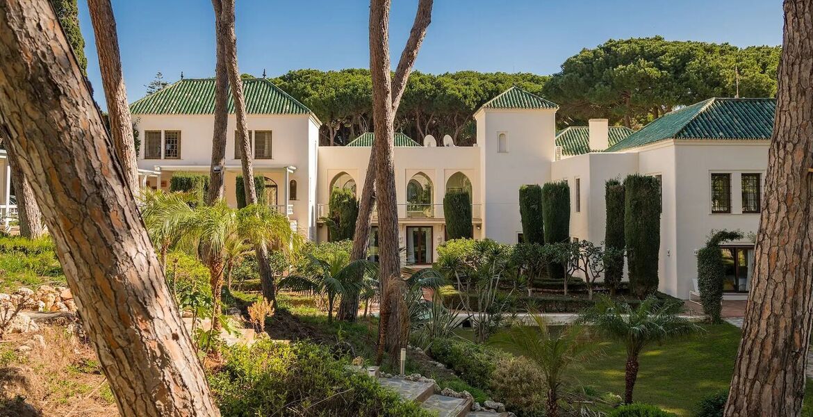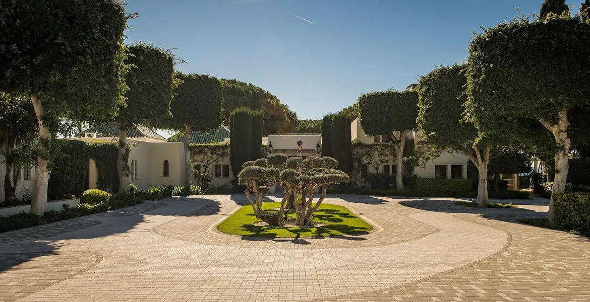 This exceptional property, designed in Andalusian Moorish style by renowned architect Robert Mosher, boasts 15 bedrooms, multiple living areas, a sauna, a gym, a cinema, two pools, and beautifully landscaped gardens.