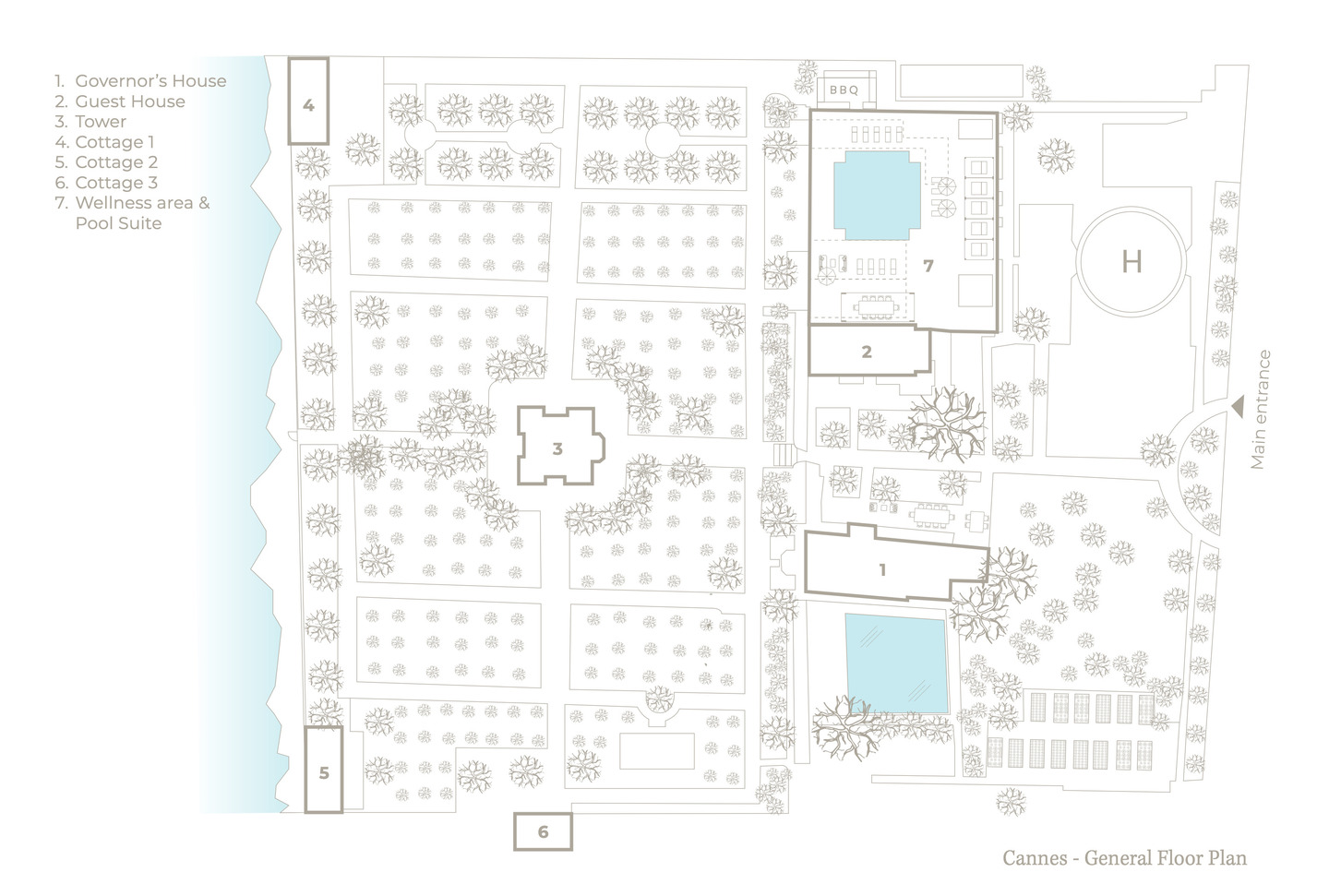 • Cottages (1, 2, & 3): Three suites (V, VI, VII).